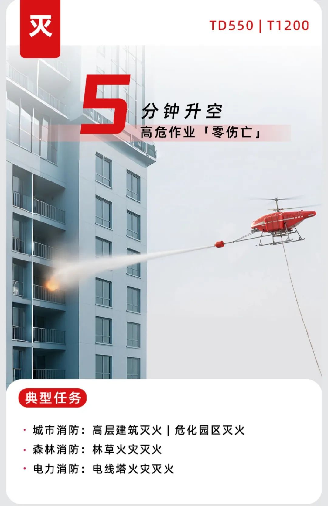 在城市高层建筑消防灭火与森林防火灭火任务中,TD550 凭借共轴无人直升机构型优势,快速响应、稳定悬停,可通过系留水带、抛投灭火弹或喷洒灭火剂等多种方式,对火源实施精准打击,同时进行火势监测与评估,为灭火指挥决策提供科学依据。