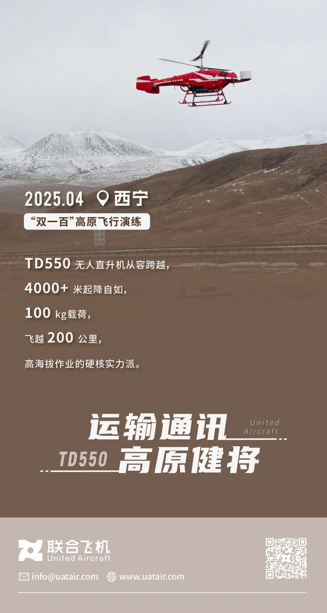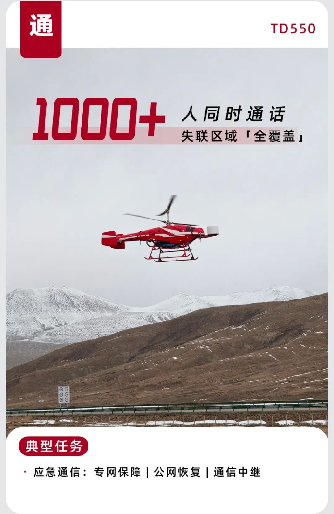 TD550 也不甘示弱,先后参与黑龙江应急通信演练、安徽黄山防汛救援任务以及四川应急通信演练。近期在西宁海拔 4000 多米的高原地区,它携带通信任务载荷和运输物资,飞越 200 公里,成为高原应急作业的中流砥柱。
