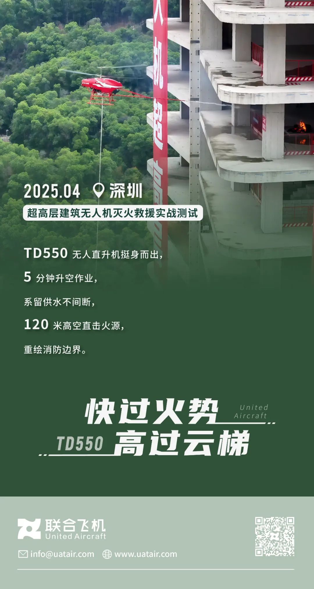深圳超高层建筑无人机灭火救援实战测试现场,去掉尾翼的TD550 轻装上阵,载荷提升,作业效率大幅提高,成功攻克 130 米以上超高建筑灭火难题,完美化解云梯高度不足的困境。