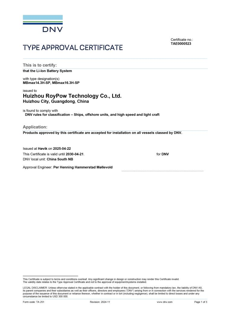 近日,在荷兰阿姆斯特丹举办的2025年欧洲电动及混合动力船舶游艇展览会期间,惠州市乐亿通科技股份有限公司(以下简称“乐亿通”)推出的船用动力锂电池系统正式获得由国际权威认证机构DNV挪威船级社颁发的DNV认证证书。值得一提的是,由于DNV对产品安全性和可靠性认证标准极其严苛,目前在全球范围内只有少数企业的产品通过认证!此次获证,标志着乐亿通船用动力锂电池系统在安全性和可靠性方面达到了国际领先水平。