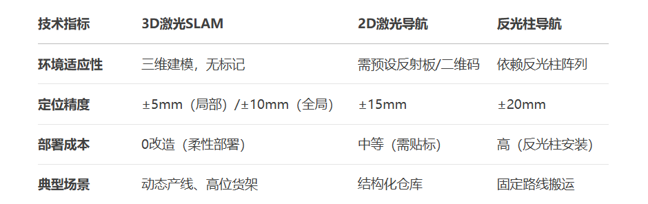 与2D方案相比,3D SLAM方案搭载了3D激光雷达和更高算力的控制器,方便机器人采集足够的环境特征完成3D建图与定位,省去了对空间环境的改造,大大提升部署效率;
