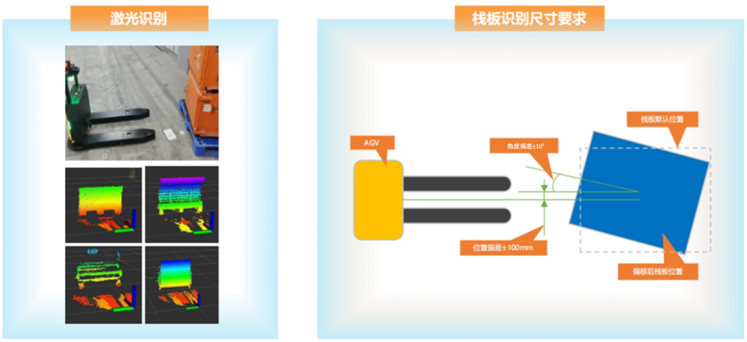 末端视觉定位(点云双目相机):通过模板匹配与亚像素边缘检测,实现托盘叉孔定位精度±5mm;