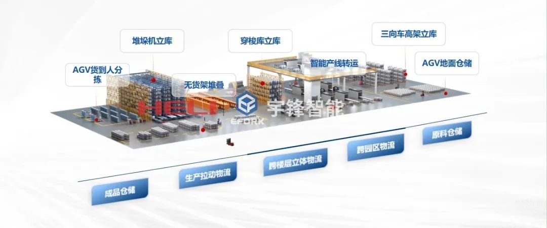 在智能工厂体系中,智能物流系统是基础性、关键性的支撑环节。宇锋智能聚焦内部物流核心场景,构建集立库仓储系统、输送系统、机器人码垛系统、AGV配送系统等在内的全流程智能物流解决方案,配套部署WCS、WMS等智能物流核心系统,实现物流作业环节与生产装配的高效协同。通过融合自动化技术与物联网应用,打破数据孤岛、提升系统协同效能,真正实现“拣、储、配”一体化的智能运作,为企业全面提升生产效率与管理水平提供强有力支撑。