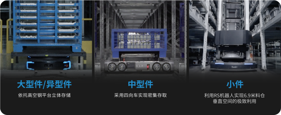 小件存于货箱机器人的6.9米高小料仓;中型件存于四向车立库;大型件/异型件存于高空钢平台,由货架机器人存取和搬运。
