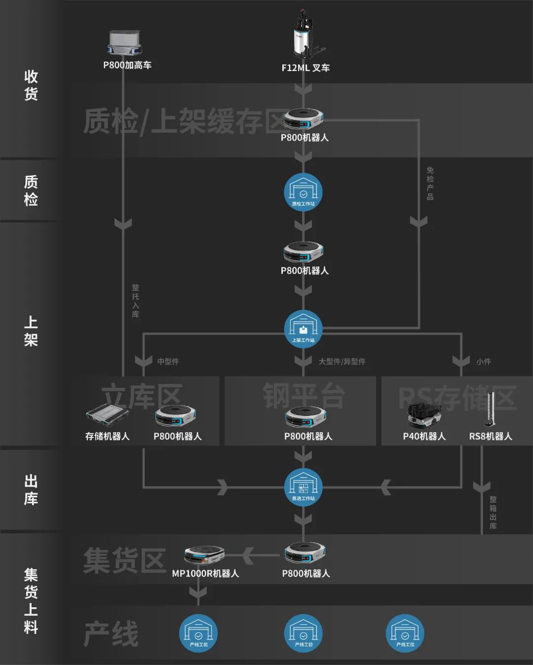 在极智嘉机器人系统的AI智能调度下,货架拣选机器人P800、货箱拣选机器人RS8、小型货箱搬运机器人P40、存储机器人X1200、智能搬运机器人MP1000R和无人叉车F12ML分工协作,无缝衔接收货、质检、上架、仓储、拣选、配送直至产线送料全流程。