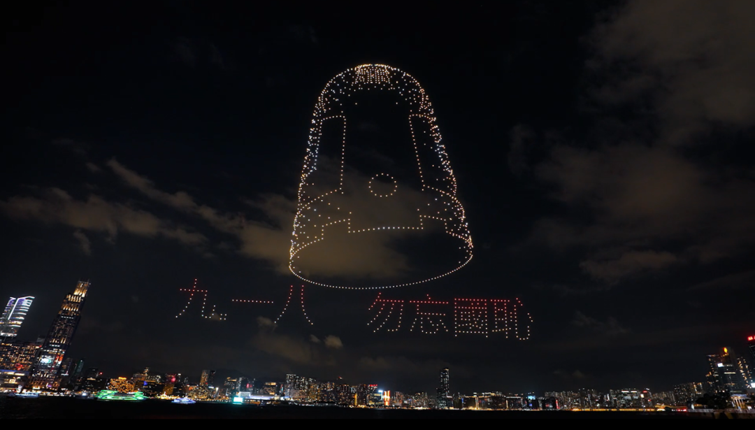 当晚,在众人欢呼声中,一只巨大的钟在维港上空徐徐摆动,下面有一行字:“九·一八 勿忘国耻”,由此拉开此次纪念中国人民抗日战争暨世界反法西斯战争胜利80周年大型无人机汇演的序幕。其后,卢沟桥事变、持枪立于船头的东江纵队战士、庆祝台儿庄大捷的漫天烟花,以及《大公报》1945年8月15日头版报道“日本投降矣”等画面依次出现,将历史节点与城市记忆串联,展现全民同心、共御外侮的峥嵘岁月。