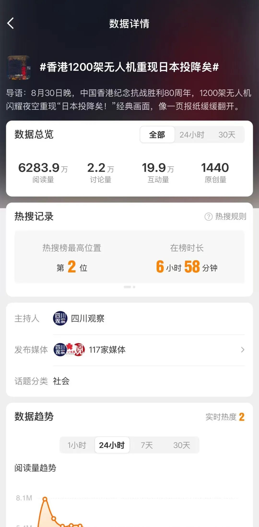来源:微博“香港1200架无人机重现日本投降矣”话题数据统计