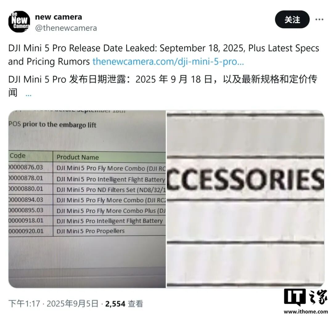 IT之家 9 月 15 日消息,科技媒体 Notebook Check 昨日(9 月 14 日)发布博文,分享了一组图片,曝料称大疆(DJI)计划 9 月 18 日发布 Mini 5 Pro 无人机。