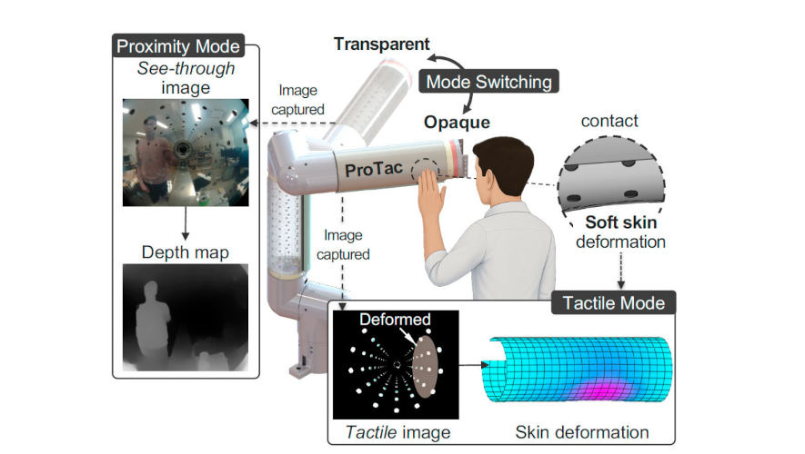研究人员已经构建了一个原型 ProTac 链接——一个圆柱形机械臂段,其末端带有柔软的传感皮肤和立体摄像头。该系统可以从多个角度检测接近的物体,估算距离,并高精度识别触点。它支持自适应行为,例如根据与障碍物的距离调整速度。