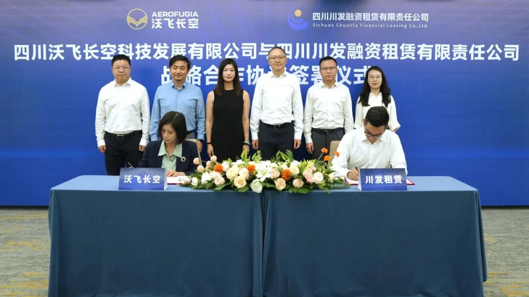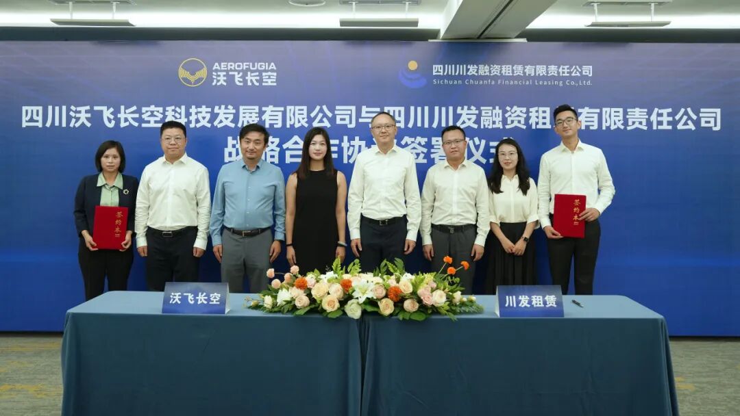 现场,在四川发展总经济师刘柯柯,沃飞长空董事长顾文婷,川发租赁董事长粟立,沃飞长空CEO兼首席科学家郭亮,川发租赁副总经理黄远茗,沃飞长空首席公共事务官肖前志的共同见证下,川发租赁副总经理柳奕朴与沃飞长空董事会秘书兼战略投资部总经理王晓敏分别代表双方签署了战略合作协议。