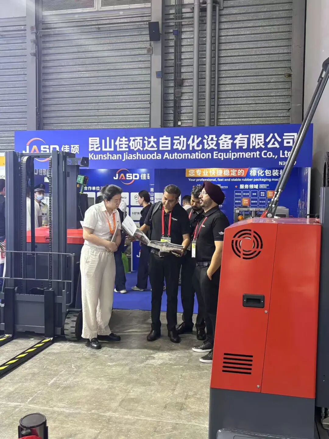 展会现场,合肥搬易通MiMA的展位吸引了大量专业观众驻足。销售人员与客户们深入交流,详细了解橡胶行业在物料搬运中遇到的痛点问题。