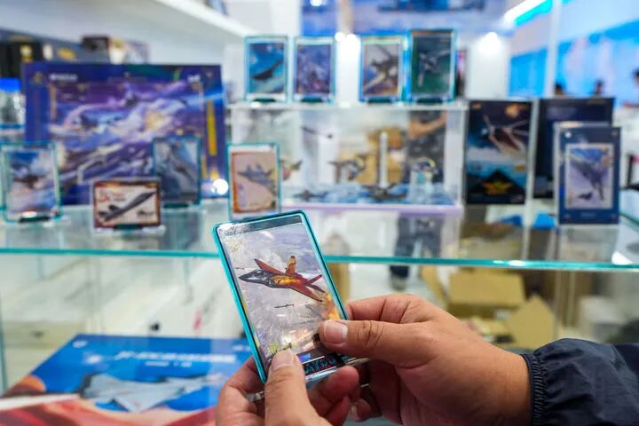 9月19日至23日,2025年长春航空展在长春国际航空博览城举办,吸引诸多参观者观展。图为一位参观者在展会现场选购航空文创产品卡游致胜空天中国战机卡牌。新华社记者 许畅 摄