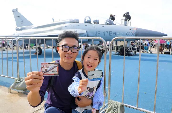 9月19日至23日,2025年长春航空展在长春国际航空博览城举办,吸引诸多参观者观展。图为一对父女在展会现场用航空文创产品卡游致胜空天中国战机卡牌打卡中国战机。新华社记者 许畅 摄