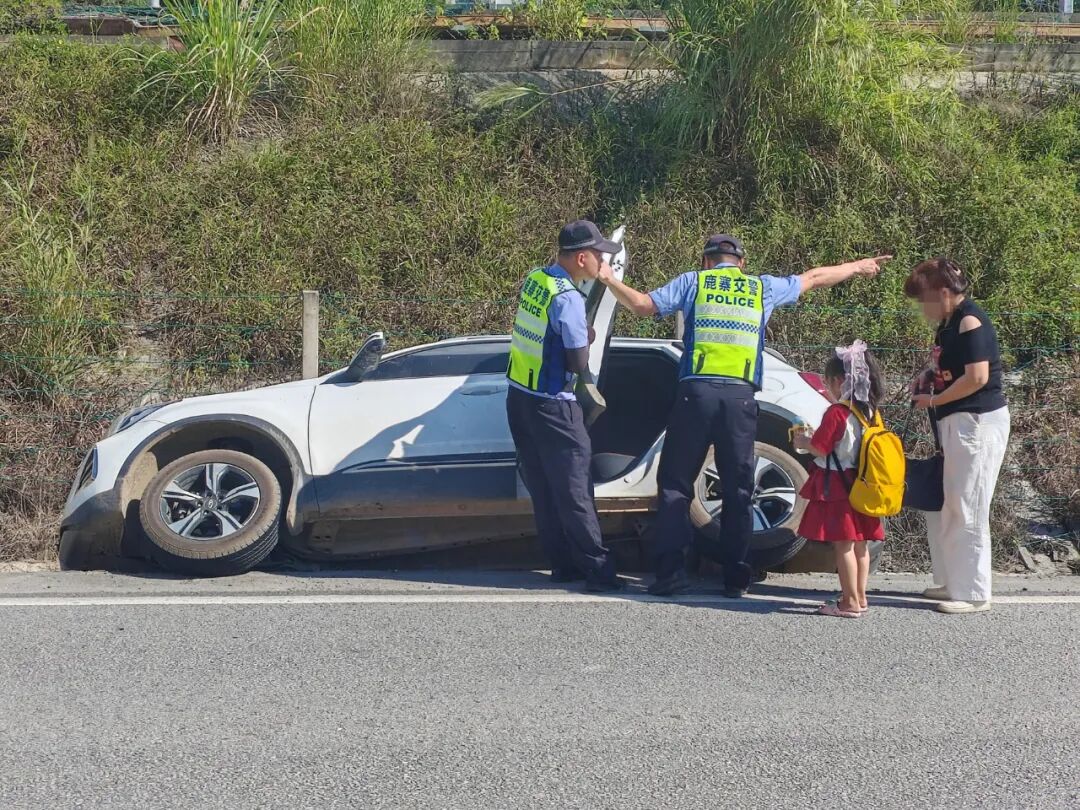 10 月 3 日 15 时许,鹿寨大队民辅警巡逻至国道 322 线黄冕路段,发现一辆车辆侧翻。民辅警迅速停车,不顾车辆可能存在的二次风险,第一时间拉开变形车门,将被困的驾驶员周女士及车内未成年儿童安全救出。随后设置警示标识保护现场、疏导车流,还主动递上矿泉水缓解两人紧张情绪,协助联系救援车辆处理后续。事后周女士多次致谢:“多亏你们及时帮忙,不然真不知道该怎么办!”