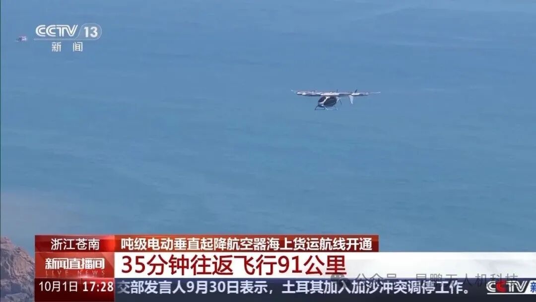 10月1日,我国首条吨级电动垂直起降航空器海上货运航线在浙江苍南正式启用。这是一条往返于苍南168黄金海岸与“华能苍南4号”升压站平台之间的航线,往返总里程达91公里,全程耗时35分钟。