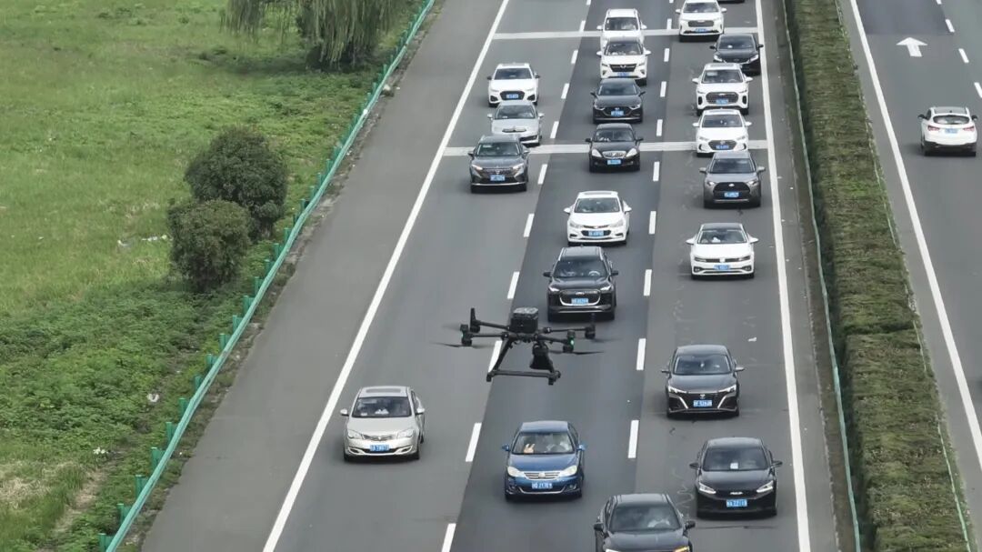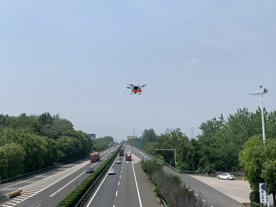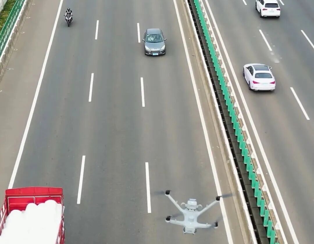 阜阳交警在滁新高速颍上段开展无人机护航,利用无人机查看动态路况,提前发现堵点和事故,做到快撤快处,保障道路安全畅通。