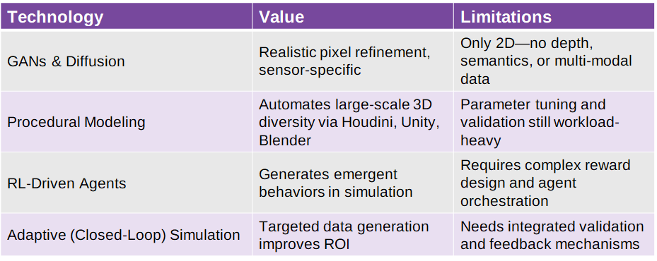 基于GAN 的纹理真实感细化、可扩展场景变化的程序建模以及 RL 驱动的突发行为模拟等新兴技术正在使合成数据更加多样化、动态化和自适应。