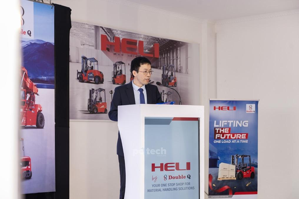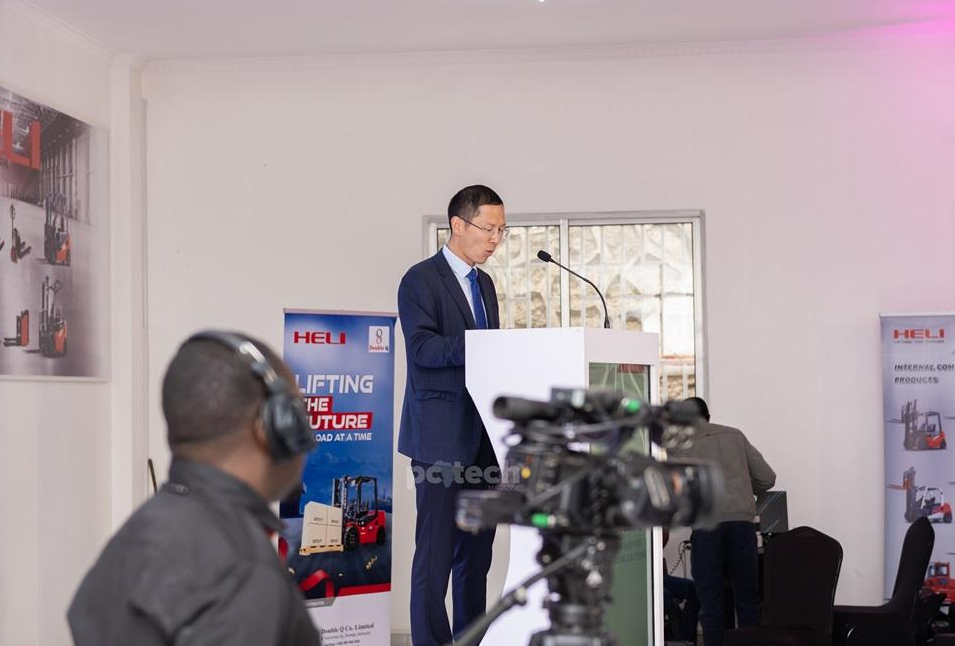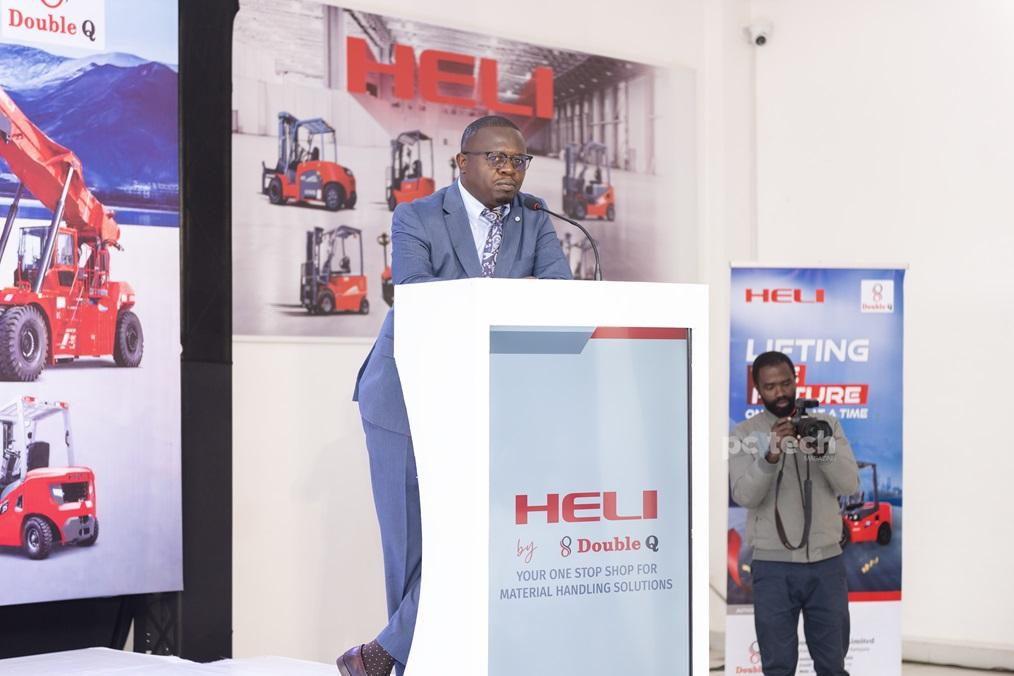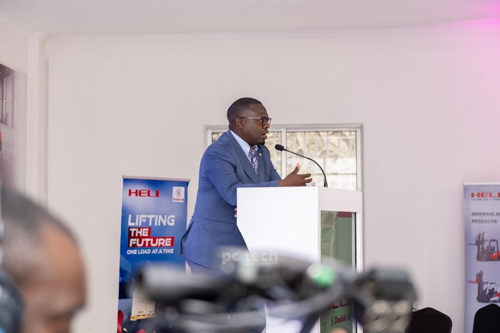 Double Q 营销主管 Richard Musani 在乌干达全新 Heli 叉车发布会上发表讲话。