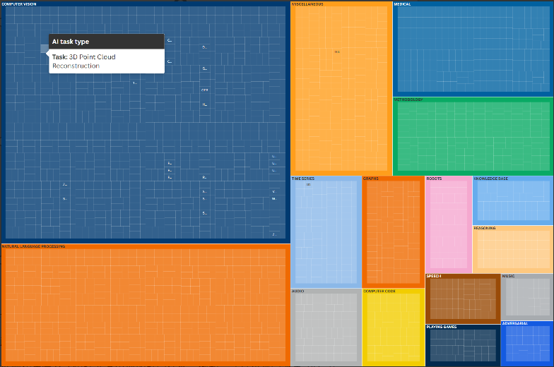 为了理解这种多样性,我们从Papers with Code 的最新 (SOTA)排行榜中抓取了一个开放的 AI 模型数据集。该数据集涵盖了数百个基准测试中的 20,000 多个任务。这些资源来自各种技术论文(例如 arXiv 预印本、AI 会议论文集等)、排行榜(例如SuperGLUE、HELM、Visual Questions answer reasoning)以及相关的 GitHub 代码库。该数据集提供了数千个机器学习和 AI 任务及模型的基准性能。