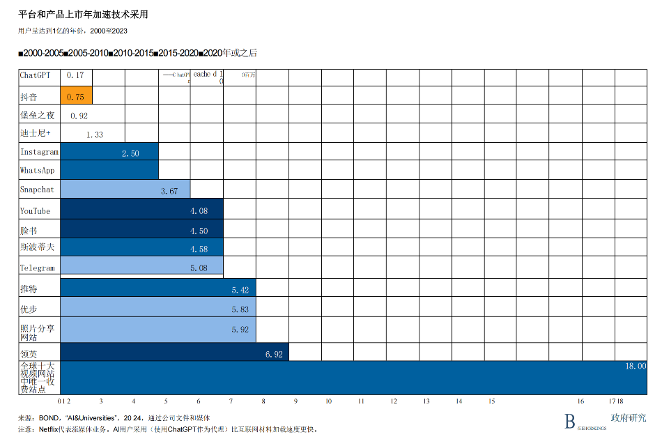 对大型模型的关注反映了生成式人工智能进入公众意识和职场应用的速度。如图4所示,ChatGPT在短短几个月内就拥有了1亿用户,其普及速度甚至超过了Instagram、Facebook甚至iPhone等平台。这种可及性和普及度的急剧上升曲线在技术传播史上是前所未有的。它标志着人们对数字化的基准预期和技术普及时间从数年缩短至数天。