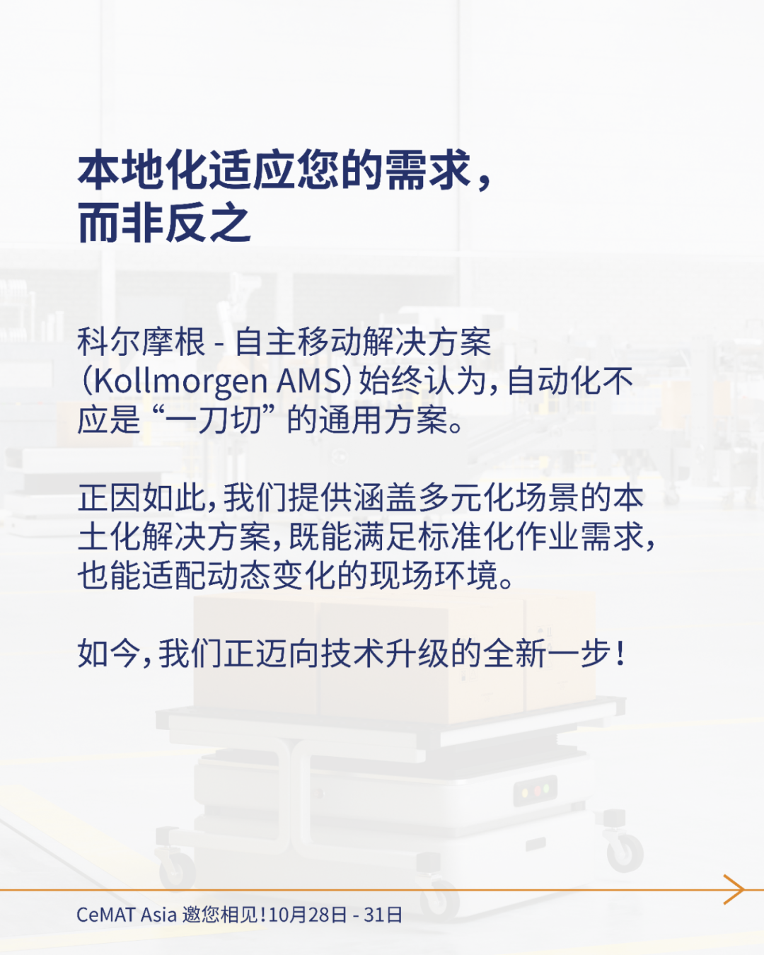 凭借在AGV与AMR领域50余年的深耕经验,科尔摩根提供涵盖多元化场景的本土化解决方案,如基于磁条或磁点定位,基于反射板的定位和基于2D激光雷达的自然特征定位。未来,我们将要推出基于3D激光雷达的自然特征定位。全新升级:支持基于视觉的定位方案基于视觉的定位方案通过摄像头与图像处理技术确定车辆位置,无需完全依赖GPS 或物理标记,尤其适用于基础设施简化的动态环境。除定位功能外,该视觉系统还可通过图像输入对物体进行分类,并根据场景实时调整车辆路径(例如,当托盘出现偏移时,可自动适配)。科尔摩根 - 自主移动解决方案诚邀您莅临CeMAT Asia,2025 年10月28日- 31日,我们的展台号是W5-A3,与我们的专家团队深入交流,亲身体验以下核心技术与方案:· 基于视觉定位的方案· 基于 3D 激光雷达的自然特征定位· 货架识别、动态负载对接等高级功能· 现场实时演示· 以及更多创新技术与应用场景……