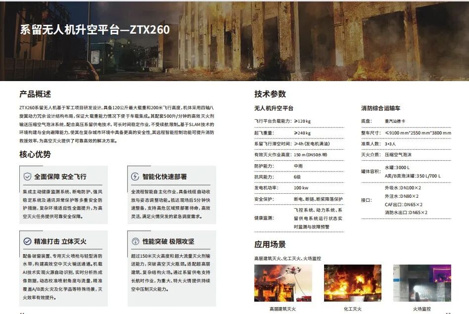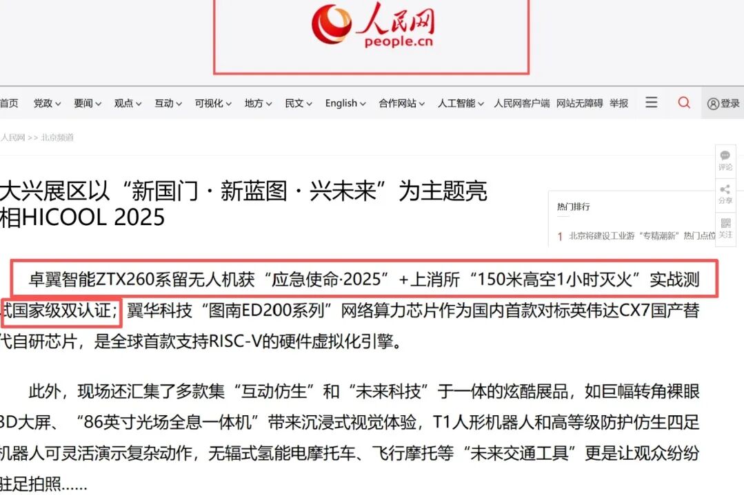 其中,人民网在报道中特别提及ZTX260系留无人机,并着重强调了其获得的“国家级双重认证”:该产品不仅作为核心装备入选了“应急使命·2025”城市高层建筑灭火演习,更通过了国家消防装备质量检验检测中心(上消所)的严苛标准实飞检验,创下150米高度连续喷射泡沫灭火剂1小时的国内纪录。这标志着国家级权威媒体对卓翼智能产品技术领先性、创新性与实战可靠性的高度认可。