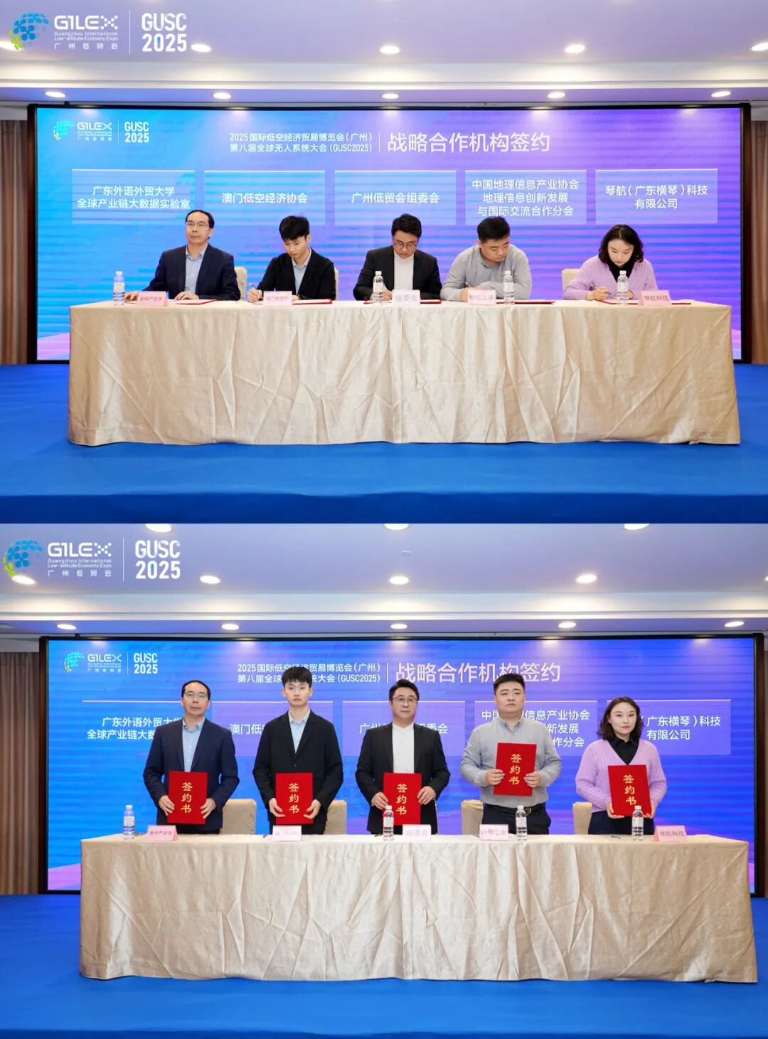 发布会现场签约环节,广东外语外贸大学全球产业链大数据实验室、世界地信之家、澳门低空经济协会、琴航(广东横琴)科技有限公司等权威机构代表签订系列合作协议,共同推动国际贸易合作落地,为低贸会提前注入强劲动能。