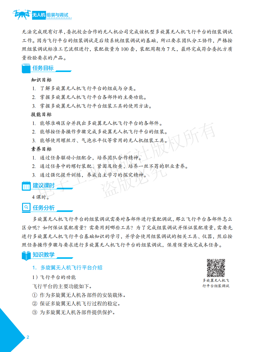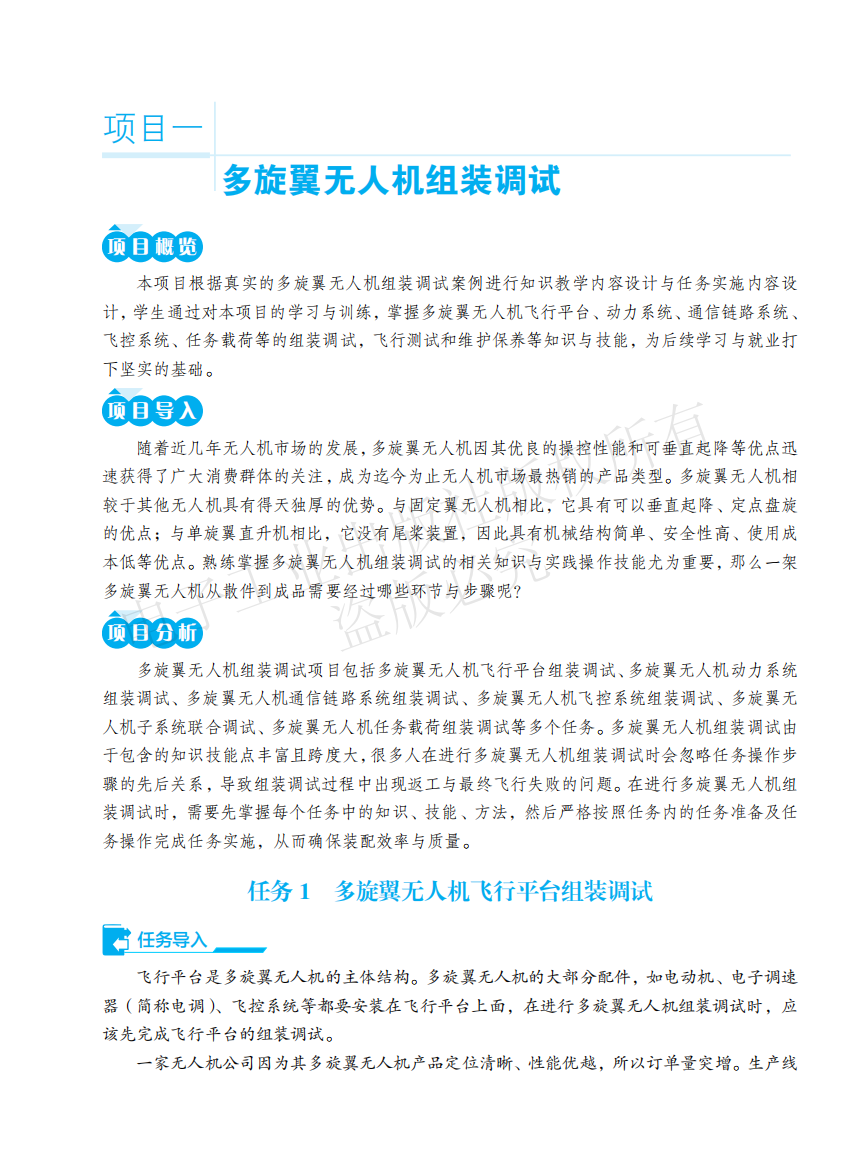 《无人机组装与调试》以 “三大模块” 破解中高职衔接难题:依据《无人机操控与调试》前言内容,本教材严格遵循 “遵循标准、突出技能、降低难度、鼓励创新” 原则,将 “中高职衔接” 贯穿核心架构,通过科学模块划分与内容排布,为无人机专业学生搭建连贯学习路径,核心设计亮点如下: