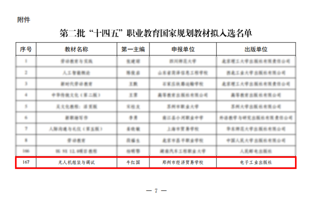2025年11月3日,教育部职业教育与成人教育司公示第二批 “十四五” 职业教育国家规划教材名单(详情见附件),由郑州市经济贸易学校、深圳信息职业技术大学、西安天翼智飞科技集团有限公司(以下简称 “天翼科技”)及电子工业出版社有限公司联合打造的《无人机组装与调试》荣耀入选!