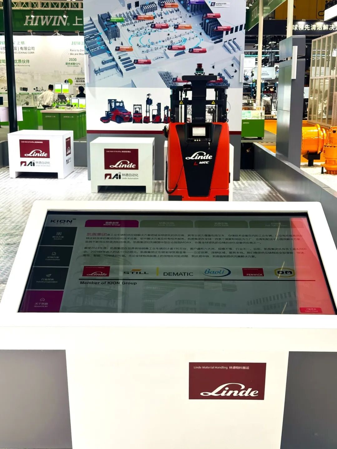 步入林德展区,此次全新推出了凯傲多媒体互动软件系统,这一系统整合了林德全系列产品及行业解决方案。通过数字交互形式,来宾可通过触摸大屏,根据页面提示,输入工况需求,系统即可自动生成最适合的物流方案,为访客提供高度定制化的物流咨询体验。