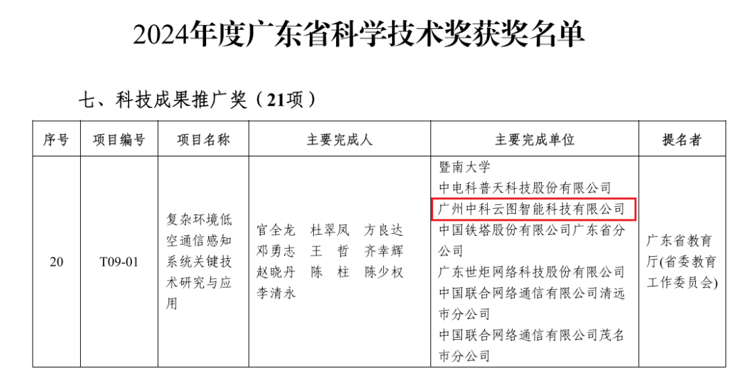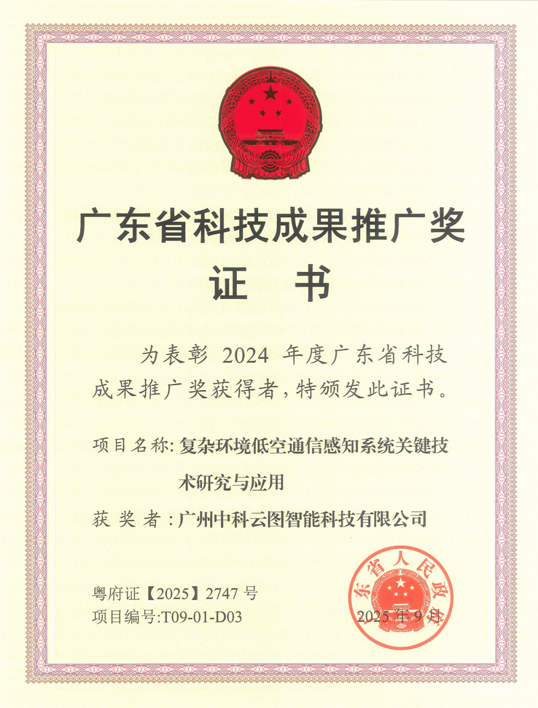 近日,2024年度广东省科学技术奖获奖名单正式公布。由中科云图参与完成的《复杂环境低空通信感知系统关键技术研究与应用》项目,荣获“科技成果推广奖”。