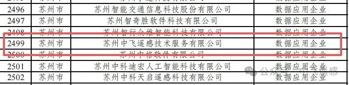 近日,江苏省数据局公布了2025年度一批拟入库培育数据企业名单,苏州中飞遥感技术服务有限公司凭借在数据技术领域的扎实积淀、创新能力与优质服务,成功入选!这既是对公司深耕遥感数据产业、践行数字经济发展理念的高度认可,更是公司迈向高质量发展新征程的重要里程碑。