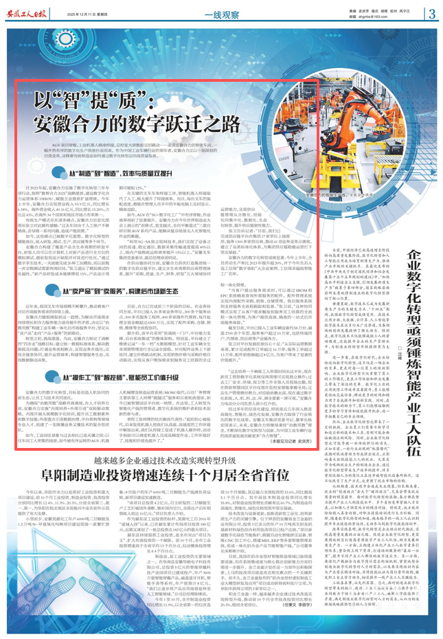 老焊工张师傅的经历颇具代表性:“起初担心被取代,后来发现机器人把我们从高温、高强度的工作环境中解放出来,我们从焊接工变成了机器人操作师,动动手指就可以调度机器人完成高精度作业,工作环境好了,技能和价值也提升了。”“过去培养一个熟练工人所需时间长达半年,现在新员工借助数字化系统仅两周便可实现独立操作;过去工厂安全、环境、保卫等工作全靠人员现场出勤,现在借助智慧园区平台仅需在监控室便能掌握全局;过去生产管理费时费力,对经验依赖太深,现在通过数字化系统,人、机、料、法、环、测全要素一屏可观。”安徽合力股份有限公司电动分公司负责人徐小红介绍。