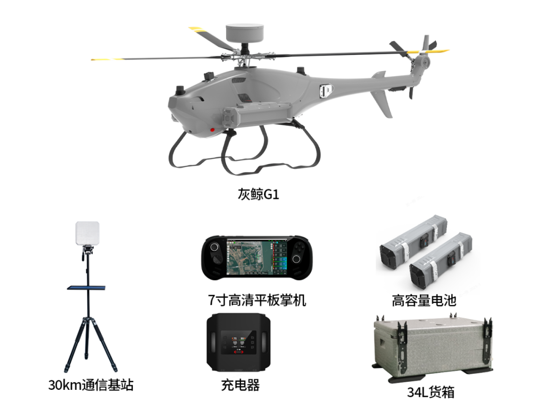 设备性能:灰鲸G1最大运载能力为15kg,控制半径30km,满载可达20km有效航程,具备AB点起降功能,自带FPV镜头,支持箱运及吊运,支持通信中继自主网布局。