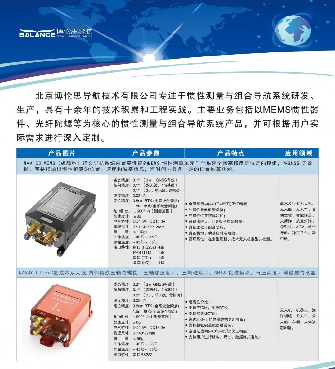 北京博伦思导航技术有限公司专注于惯性测量与组合导航系统研发、生产的高科技企业。公司核心技术团队毕业于北京航空航天大学,在惯性测量与组合导航技术领域具有十余年的技术积累和工程实践。公司现有导航类产品与市场类似产品相比,极致发挥了惯性器件一次上电稳定性和工程型滤波器一致性技术优势,全谱系产品具有高精度、高可靠、低成本的核心竞争力。