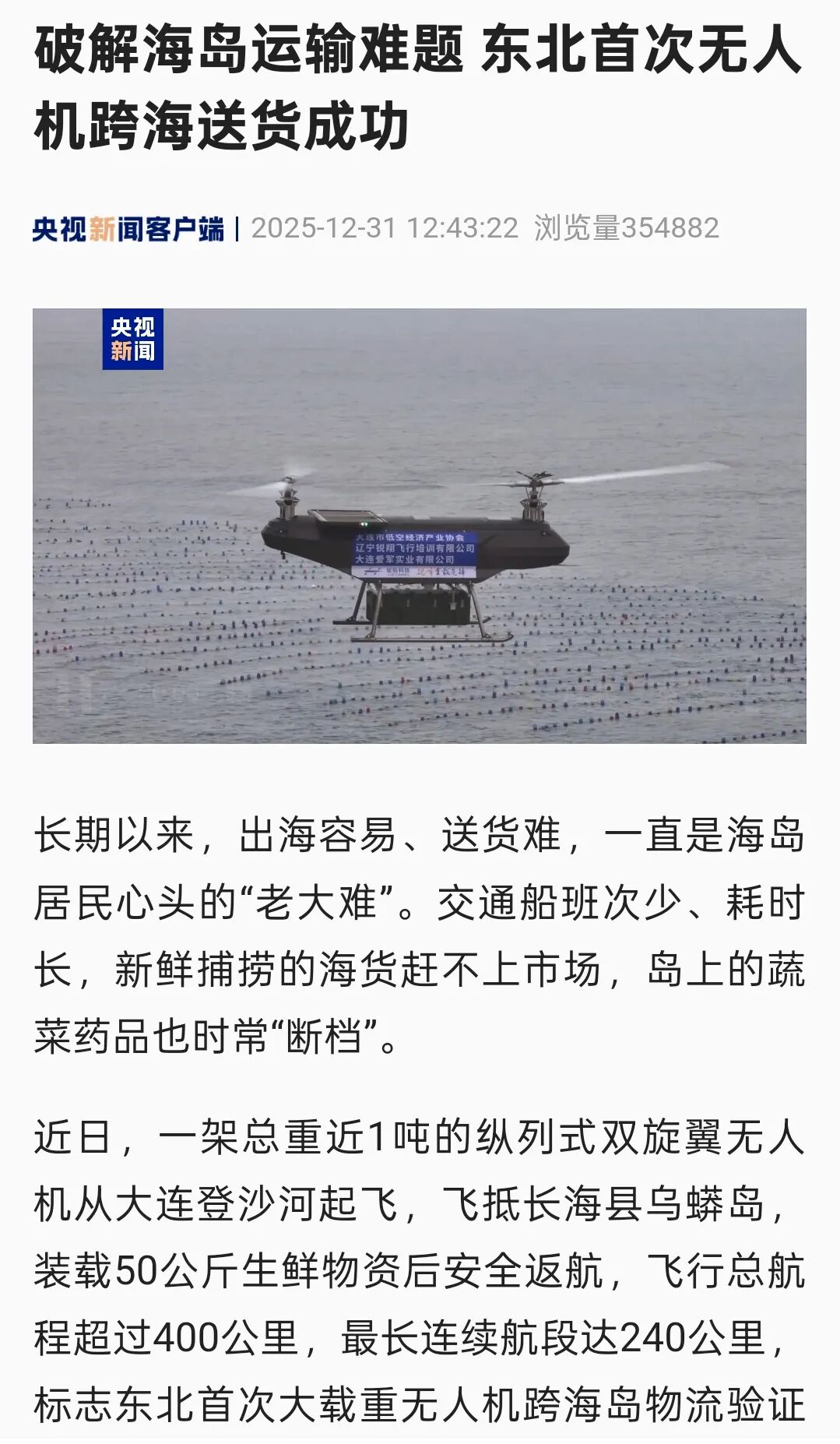 ➤央视新闻客户端报道,东北首次无人机跨海送货成功,“驼峰”纵列式重载无人机破解海岛运输难题。