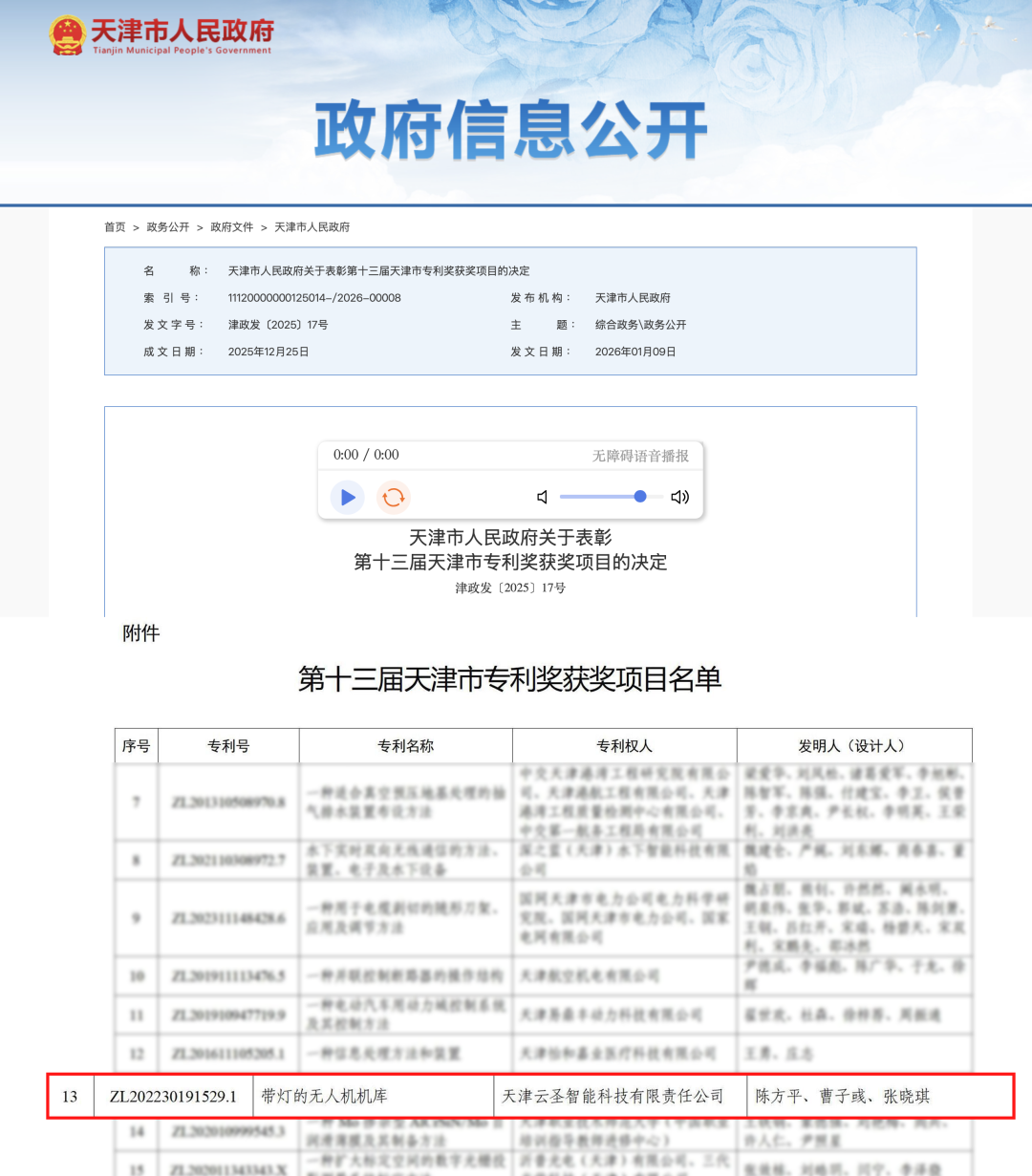 无独有偶,日前,云圣智能授权专利“带灯的无人机机库”(ZL202230191529.1)荣获第十三届天津市专利奖,并获天津市人民政府公开表彰。该奖项是天津市在专利领域的最高奖项,旨在重点表彰创新性强、经济社会效益显著的核心专利,以激励创新、推动新质生产力发展与科技进步。云圣智能凭借此专利的突出贡献,为区域高质量发展注入了技术动能。