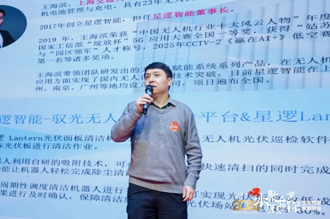 分享环节,王海滨向在场师友、同仁们展示了星逻智能近年来在低空能源领域的成果,重点介绍了公司自主研发的低空具身智能产品——Lantern光伏清洁机器人。