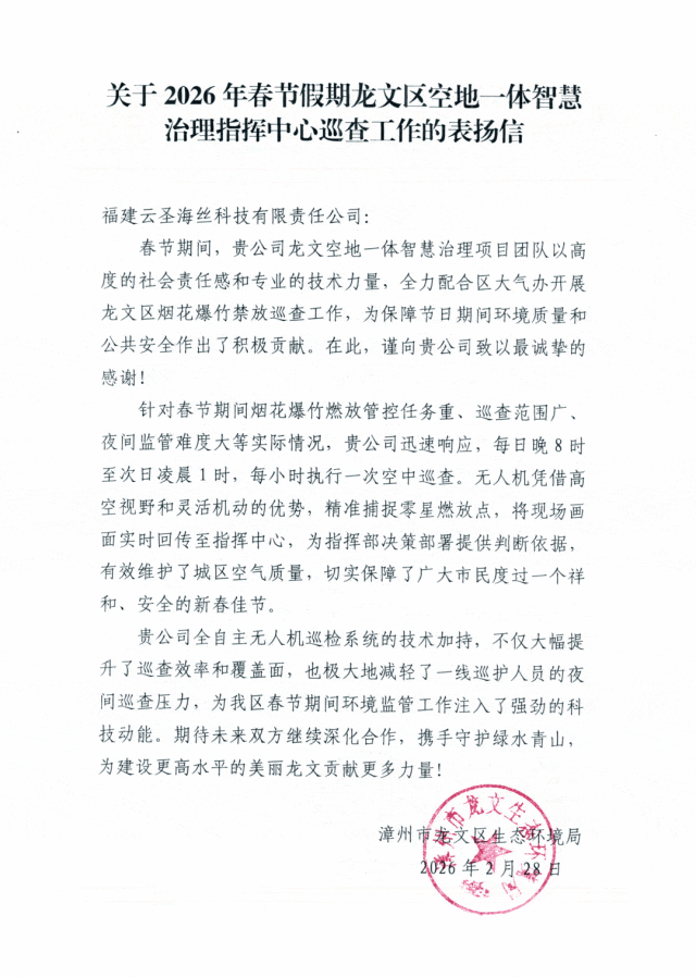 这份坚守也收获了认可,近日,福建省漳州市龙文区生态环境局、湖北省宜昌市夷陵区城市运行管理中心等单位纷纷向云圣智能发来表扬信、感谢信,对云圣智能将科技创新转化为城市治理的实效、全力保障节假日期间城市安全平稳运行表示感谢。