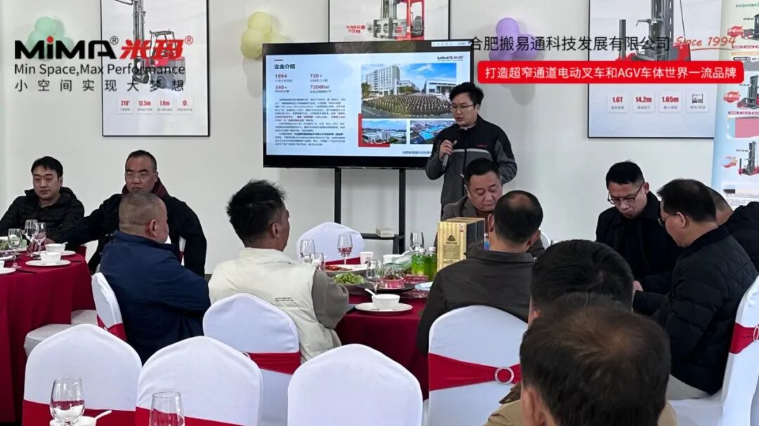 推介会现场人气高涨,交流氛围热烈。作为合肥搬易通深耕行业三十年的匠心之作,MiMA米玛全系列电动叉车重磅亮相,超窄通道系列叉车——三向系列堆垛式叉车、铰接式叉车、全向系列叉车、冷库专用车型等明星产品集中展示,成为全场焦点。