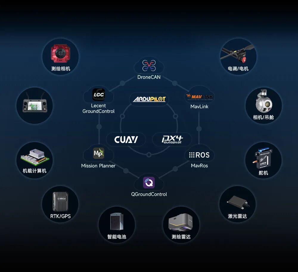 全面兼容 ArduPilot / PX4 开源生态,提供完整的固件与地面站源代码,支持用户根据自身需求快速进行二次开发与功能适配。依托成熟开源系统生态,可选负载与外设组件丰富,扩展性强,能满足多样化场景应用需求。