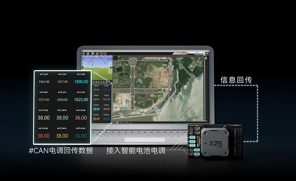 采用 DroneCAN / PWM 双油门冗余设计,支持安全切换。内置电机、电调温度与转速实时回传功能,全方位保障动力系统安全检测。
