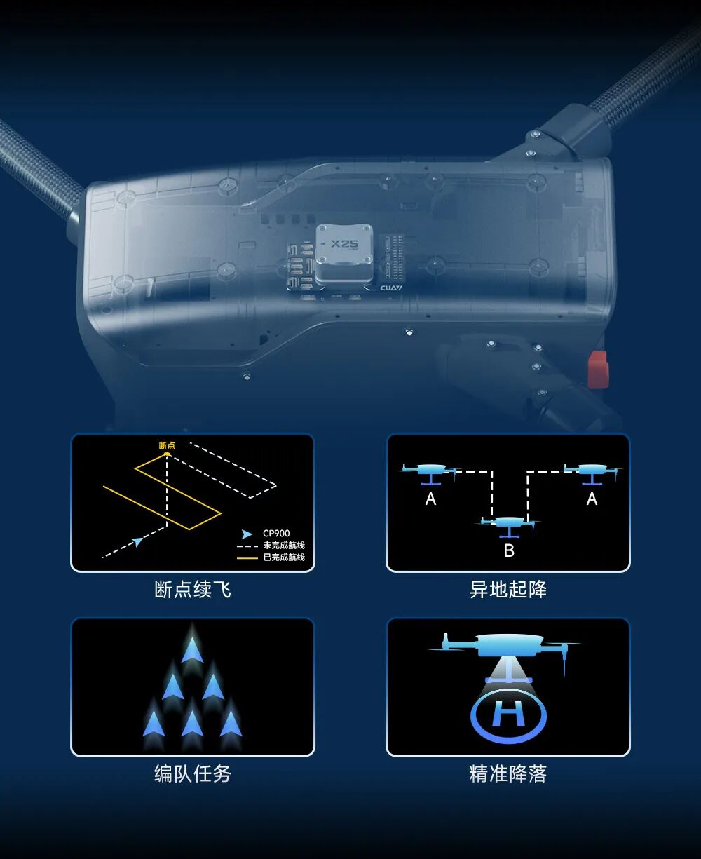 Raefly CP900 搭载自研高性能智能控制器,支持三度 IMU 冗余设计、温度补偿算法与 FFT 陷波滤波器;提供28种飞行模式及断点续飞、异地起降、编队任务、精准降落等多种智慧飞行应用。