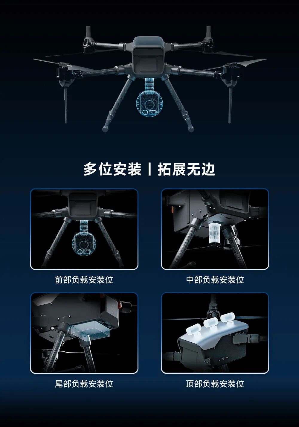 Raefly CP900 在底部、中部、前部、背部均设有负载安装位,为多种任务设备提供充足的空间,灵活适配各类作业场景。