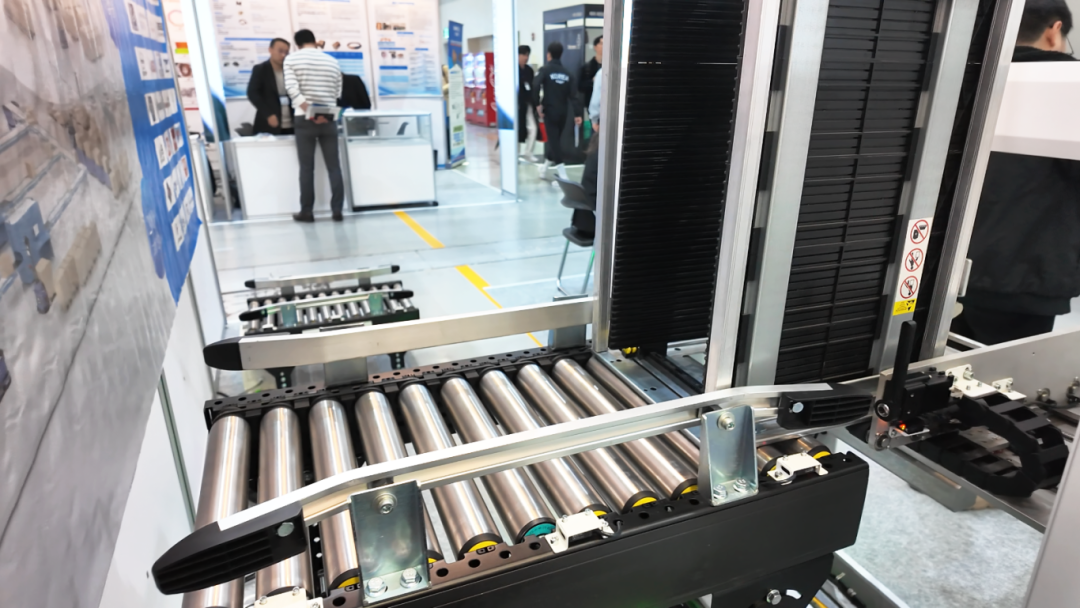 针对这一行业难题,寻迹智行(Beacon Robot)此次展出的SMT专用移动机器人采用激光SLAM导航技术,无需铺设磁条或二维码即可实现自主导航与路径规划,支持±5mm以内的高精度对接,能够灵活应对不同高度PCB料框的自动上下料需求。同时,通过智能调度系统(RMS),机器人可无缝对接SMT产线上下料机,实现满框供给、空框回收的闭环作业流程,有效打通产线与物料缓存区之间的自动化物流通道。