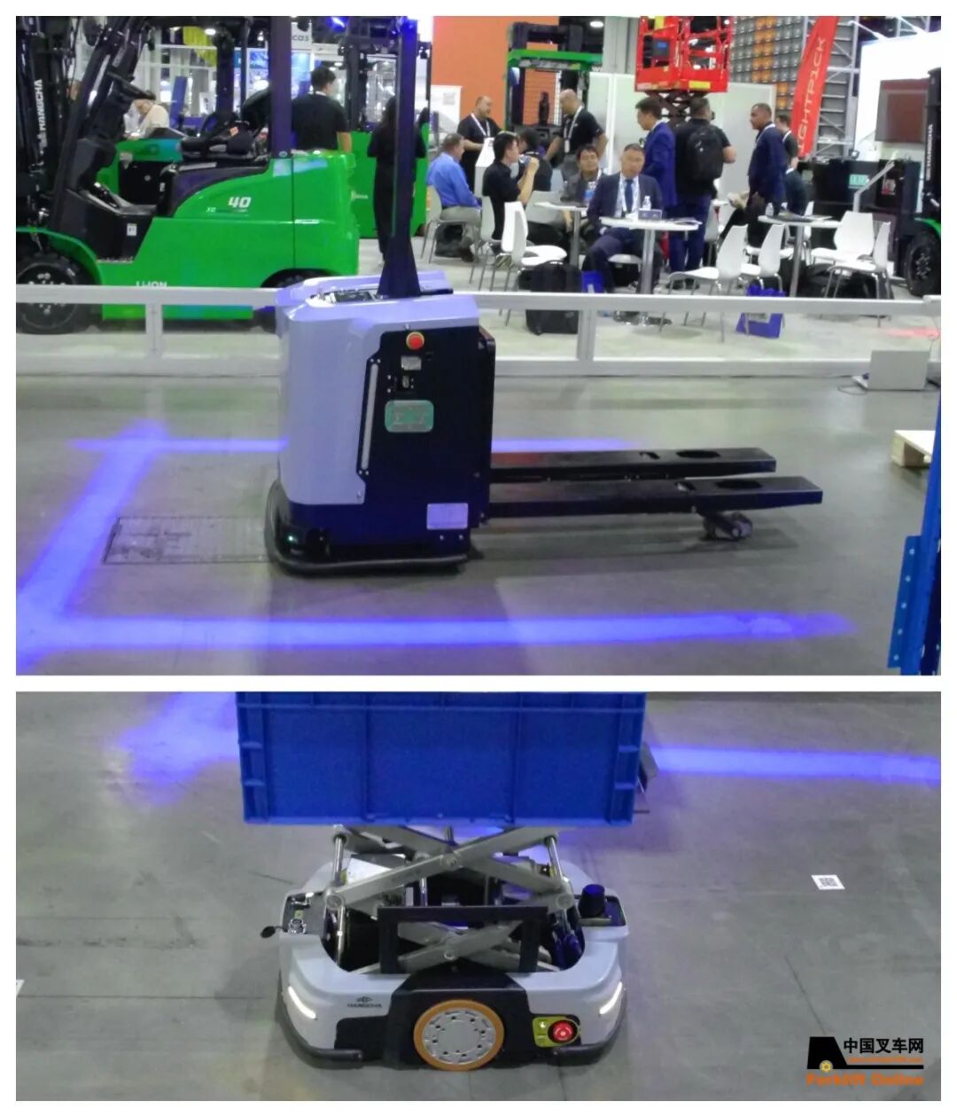 更值得注意的是,上述设备与同期展出的高性能单深位料箱堆垛机(最大拣取300kg)、AMR自主移动机器人(搬运50kg)可以在同一套调度系统下无缝协同作业,实现多机联动与智能任务分配。全系列产品采用模块化设计,部署便捷、维护成本低,且可适配VDA5050通讯协议——这一欧洲主导的AGV互联标准,恰恰说明杭叉的产品从一开始就面向全球最高要求的客户场景。