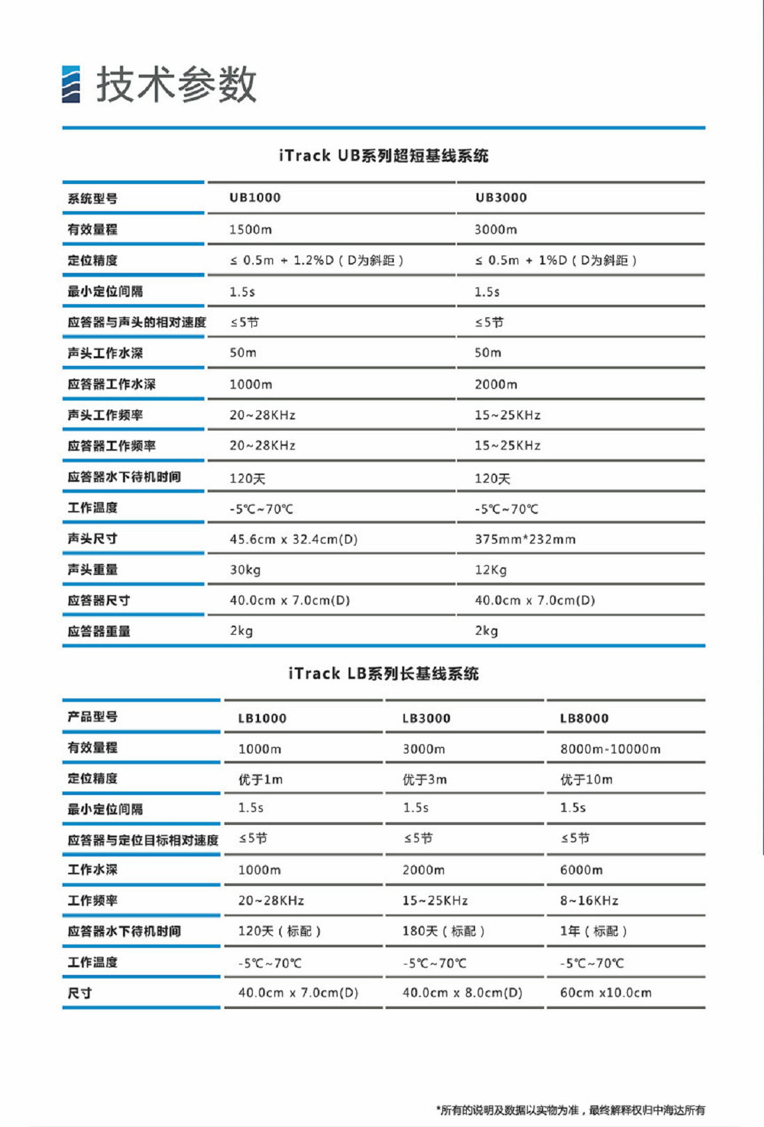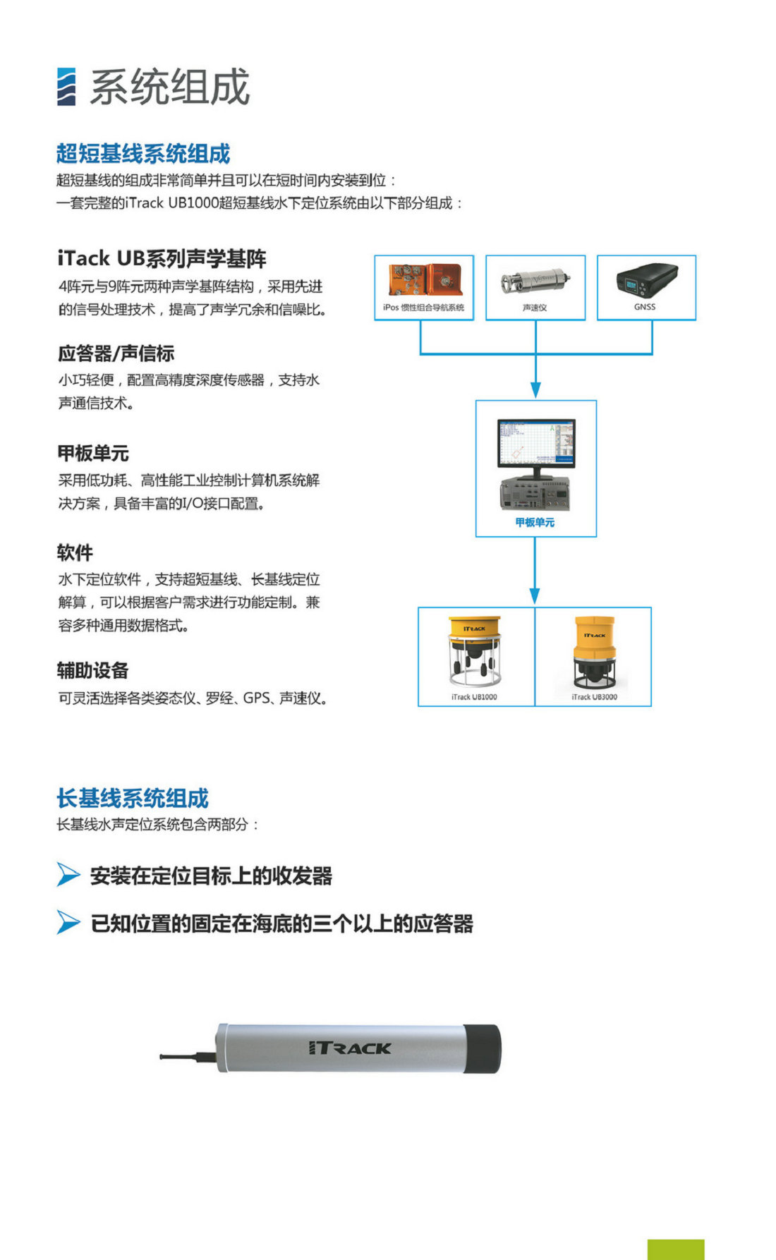 iTrack-UB系列超短基线是目前业内先进的基于水声宽带扩频技术和高精度时间同步技术的便携式超短基线水下定位系统。iTrack-UB系列超短基线将高精度的姿态传感器MRU和罗经与声学基阵一体化集成到便携式声头内部。经过严格时间同步的声信标定时发射宽带扩频水声信号。声头接收到扩频信号后,经过信号解算、斜距计算、高精度测向及位置解算得到声信标的坐标位置。iTrack-UB超短基线系列还将惯性导航与水下声学定位完美结合在一起,并融入了高精度差分RTK-GPS定位技术,可同时对多个水下目标(ROV、AUV、蛙人等)进行精确定位,并实时提供高精度的姿态及航向数据。