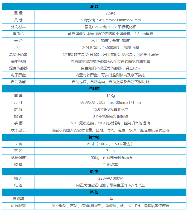 “飞鱼”号水下机器人前后各配备1080P高清摄像头,能搭载声呐、USBL、并可扩展多种微型在线检测水质传感器如PH计、盐度计等。