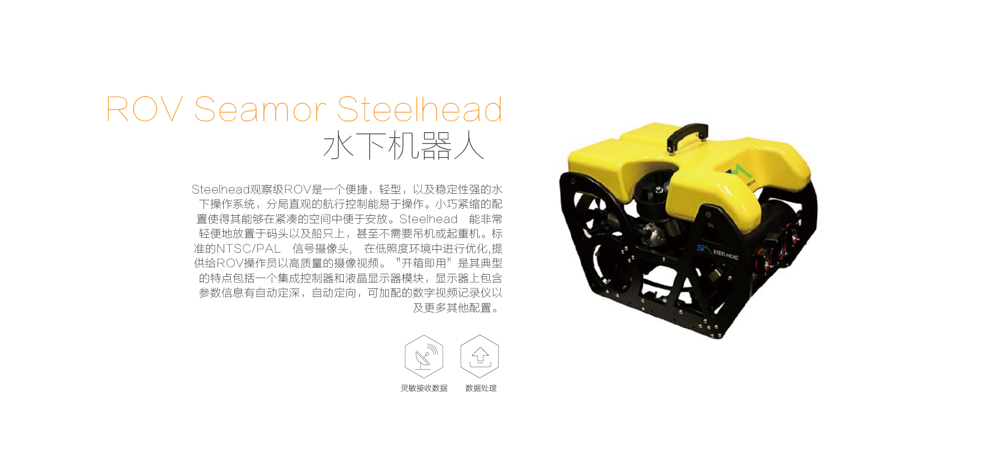 Steelhead观察级ROV是一个便捷,轻型,以及稳定性强的水下操作系统,分局直观的航行控制能易于操作。小巧紧缩的配置使得其能够在紧凑的空间中便于安放。Steelhead能非常轻便地放置于码头以及船只上,甚至不需要吊机或起重机。标准的NTSC/PAL信号摄像头,在低照度环境中进行优化,提供给ROV操作员以高质量的摄像视频。“开箱即用”是其典型的特点包括一个集成控制器和液晶显示器模块,显示器上包含参数信息有自动定深,自动定向,可加配的数字视频记录仪以及更多其他配置。