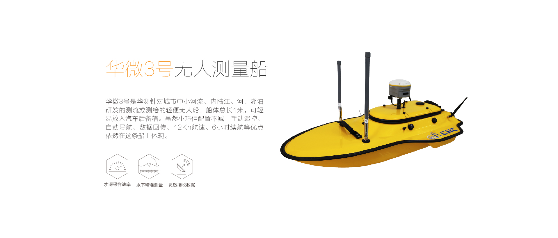 华微3号是华测自主研发的最新一款适合城市中小型河流、内陆江、河、湖泊测流或测绘的超轻便型无人船。总长1米,自重只有7KG的船体使得运输更加方便,可轻易放入汽车后备箱,单人即可作业,大大节省了人力。6m/s的最大速度,3m/s的自动导航速度,手动自动两种模式切换,根据不同的工作环境,可以选择合适的操作方式。10cm的超浅吃水,专为测绘人设计的无人船!